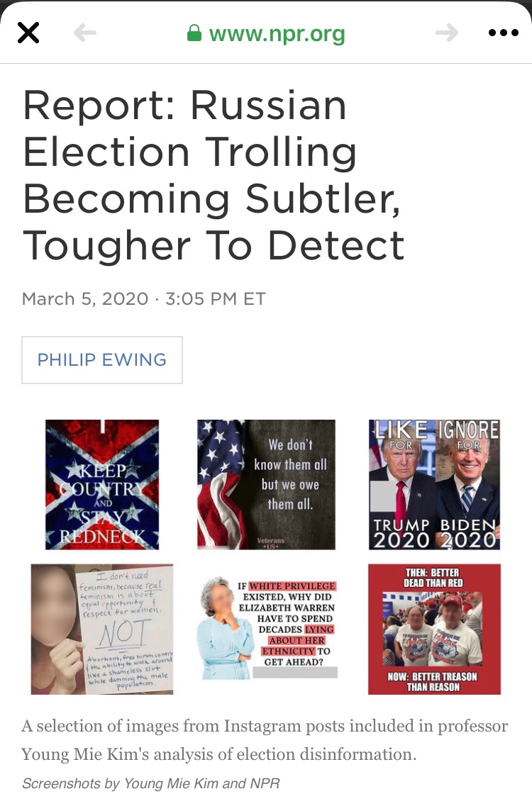 Kim and her team identified 32 Instagram accounts they said appeared to be linked to Russia's now-infamous Internet Research Agency, of which 31 later were confirmed to be IRA-linked by an analysis commissioned by Facebook, which owns Instagram.