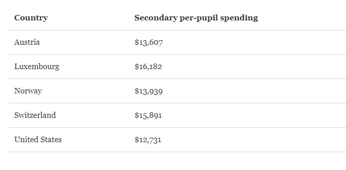 A little more tax would go a long way. However low spending does not appear to be the problem. The chart below puts it pretty high per capita on an international scale. Perhaps it is the lack of respect for the benefits of education or academia general - at a cultural level. Or the low status that teachers seem to have compared to many countries where it is seen as high status (if not highly paid).