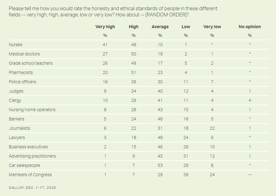 I googled "gallup 2020 survey rate professions" (no quote marks), and this is what I got: