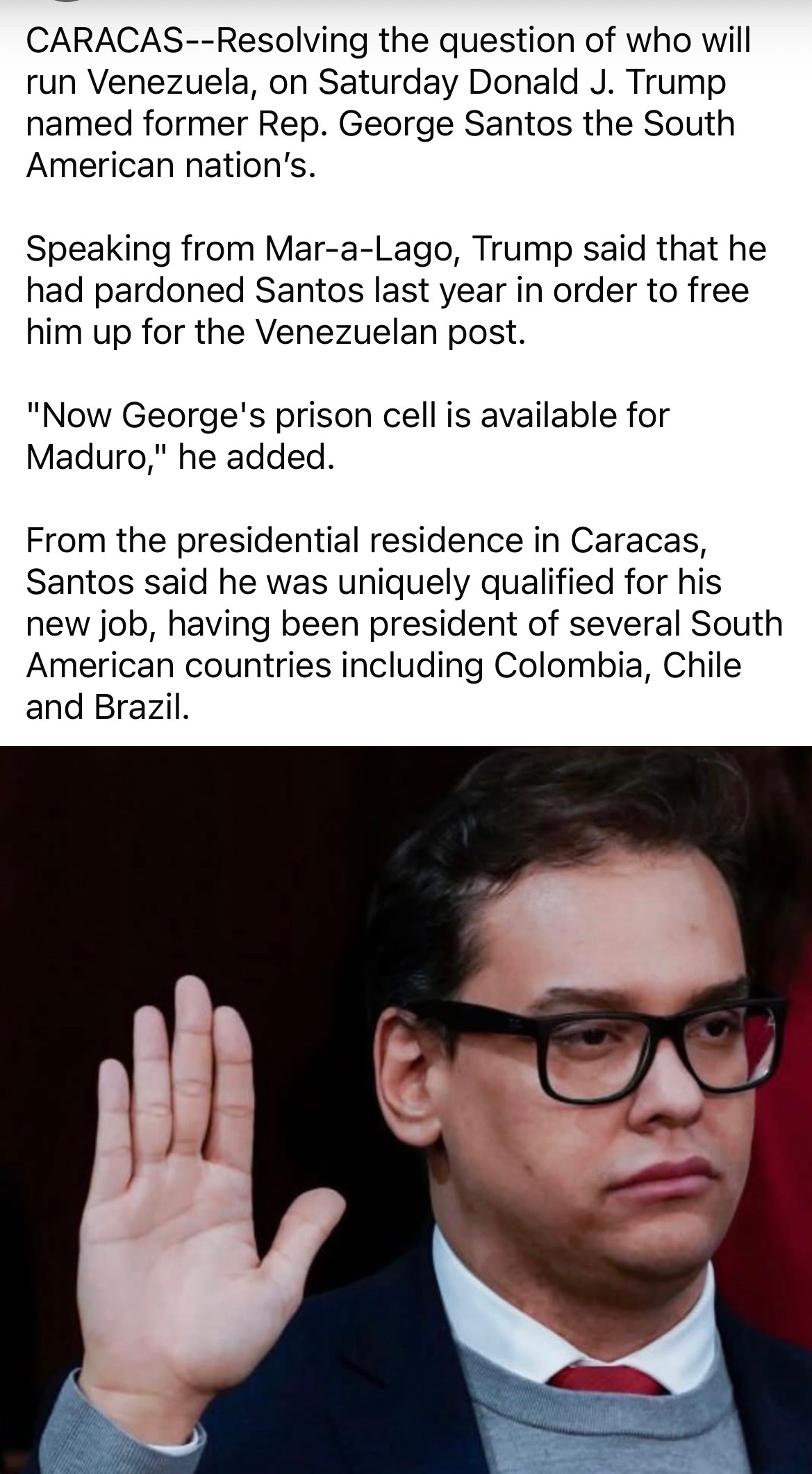 well, I don't know what mr santos had done to need a presidential pardon, but I just wonder how many troops frump is leaving in venezuela to ensure his new flunky can actually rule the country... I mean, not just to protect him from the locals, to ensure he can enforce his rule.