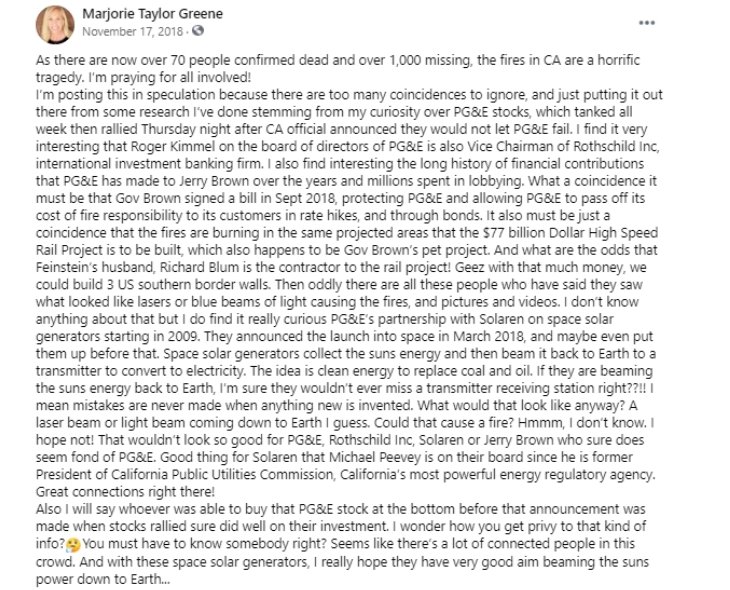 Nov 17, 2018 Greene posted on FB that wealthy Jewish bankers were using space lasers to clear land in CA for a high speed rail project.