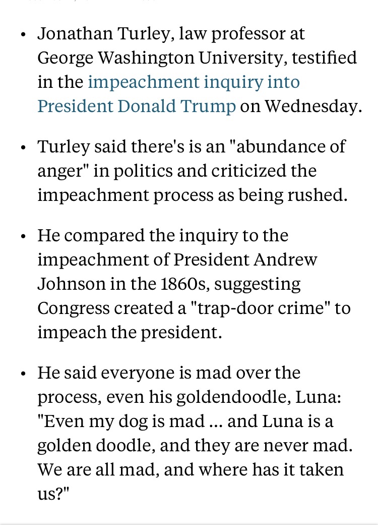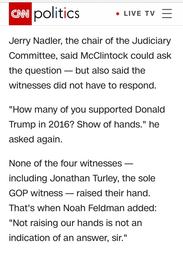 https://www.politico.com/news/2019/12/0 ... ats-075530The warning from vulnerable Democrats follows Nadler’s remarks at the Judiciary panel’s first impeachment hearing Wednesday in which he made a significant connection between Trump’s obstruction of Mueller’s investigation into Russian election interference and his potential abuse of power in pressuring Ukraine to help his reelection campaign.