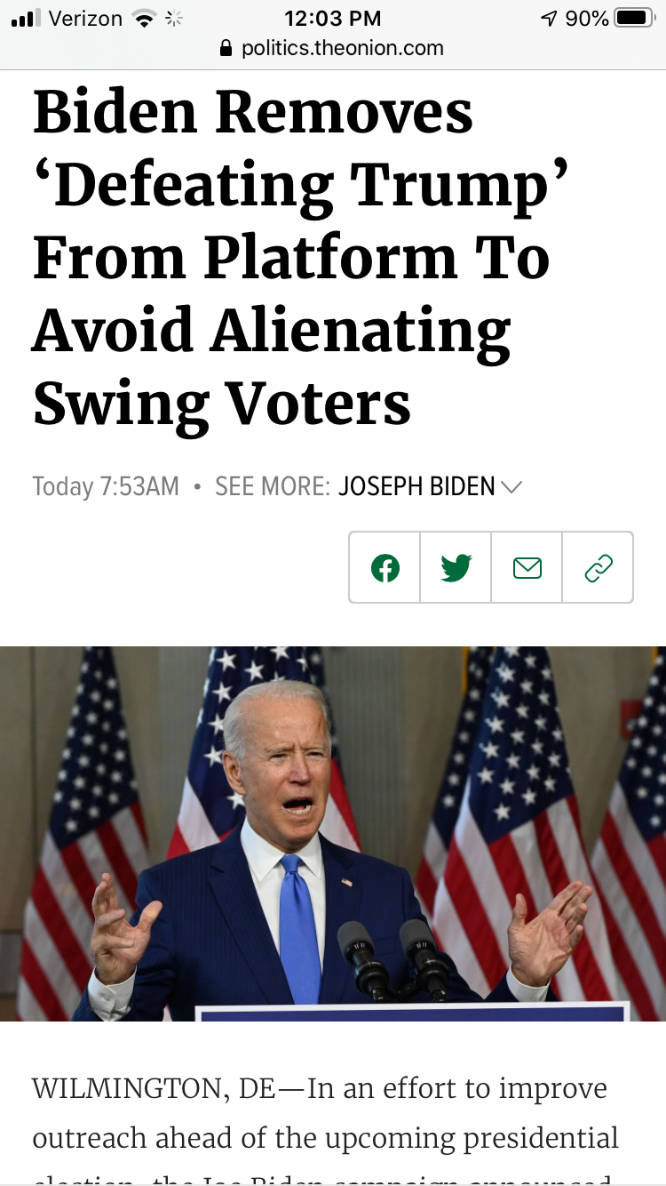 “This election is a time when we all need to come together, not cause divisiveness by focusing on trying to oust a candidate who millions of Americans support,” said Biden, the Democratic presidential nominee, announcing that he was removing all mention of trying to beat the incumbent Republican president from his campaign website and subsequent speeches. “How is making ‘defeat Trump’ a central part of my campaign platform going to play with Trump supporters? Trump voters are a huge constituency, .... it’s going to be tough to win them over if we keep alienating them with our rhetoric.