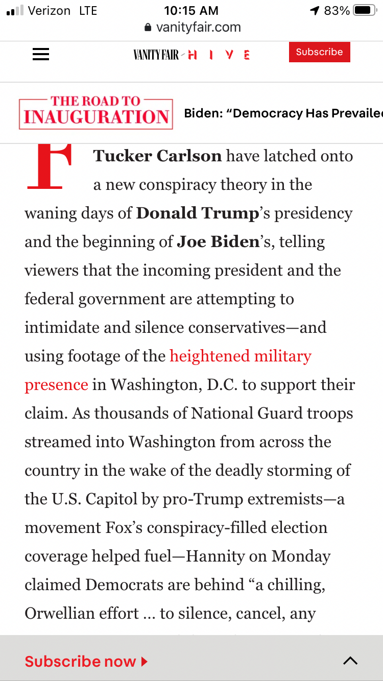 Hannity on Monday claimed Democrats are behind “a chilling, Orwellian effort … to silence, cancel, any opposition voices,” while Carlson pointed to the sight of the fortified capital ahead of the inauguration as a show of force from Democrats intending to send the message: “Do not question us. Men with guns enforce our decrees,” Axios reports.