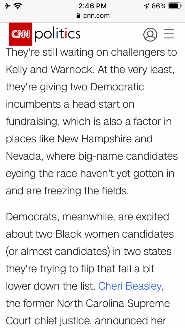Democrats, meanwhile, are excited about two Black women candidates (or almost candidates) in two states they're trying to flip that fall a bit lower down the list. Cheri Beasley, the former North Carolina Supreme Court chief justice, announced her candidacy for Senate last month, while Rep. Val Demings is planning a bid in Florida. Since Harris resigned from her seat to become vice president, there are no Black women in the Senate.