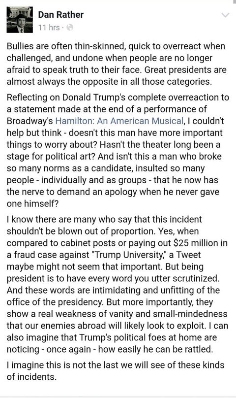 This should offer some clue to what kind of President Trump is going to be.“Vice-president elect Pence, I see you walking out, but I hope you will hear us, just a few more moments. There’s nothing to boo here, ladies and gentlemen. We’re all here sharing a story about love. We, sir, are the diverse America who are alarmed and anxious that your new administration will not protect us, our planet, our children, our parents, or defend us and uphold our inalienable rights. We truly hope this show has inspired you to uphold our American values and work on behalf of all of us. All of us. We thank you for sharing this wonderful American story, told by a diverse group of men and women of different colours, creeds and orientations."