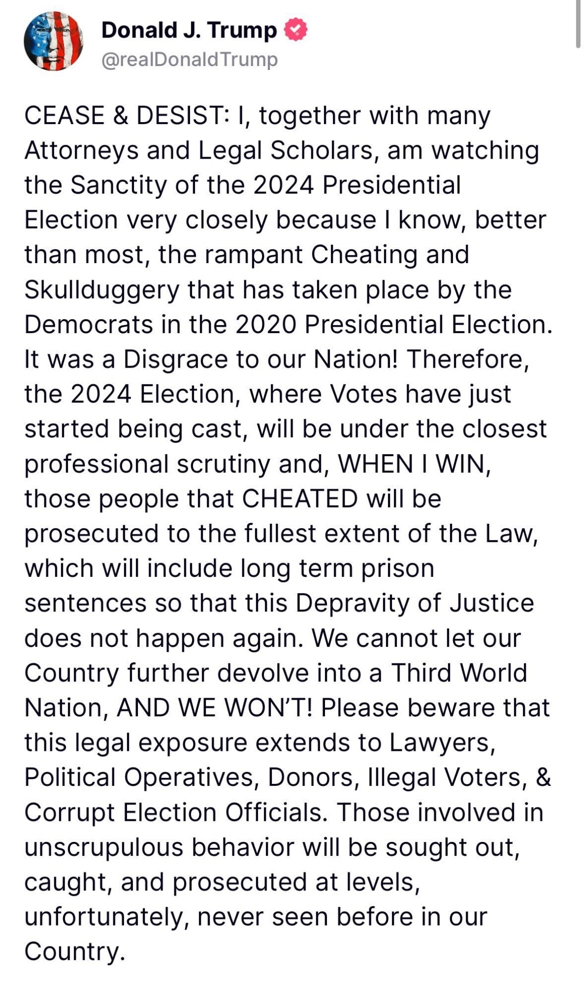 Then he will also arrest all officials and Mike Pence for stealing the 2020 election. After that Joe and Hunter Biden. And all of Biden legislation vetoed by Trump on day 1.