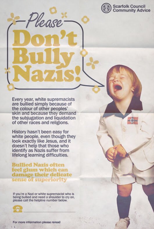 Scarfolk conflating 'learning disabilities and folks with nazi sympathies' might be funnier if there wasn't a rise in hatecrimes directed at the diasbled in the UK, don't you think? In its rush to get the stereotypical nazi its furthered the myth of 'disablement'='moral flaws' which the government is using to sanction the most vulnerable towards foodbanks etc...