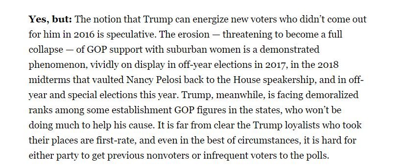 This is from a depressing politico article. It contains a point I have repeated many times. Trump cannot add any votes over last time. The 40% are stubborn and will show up, but his popularity shows he has not added any. The very few blacks that voted for him will vote again. But no new groups.