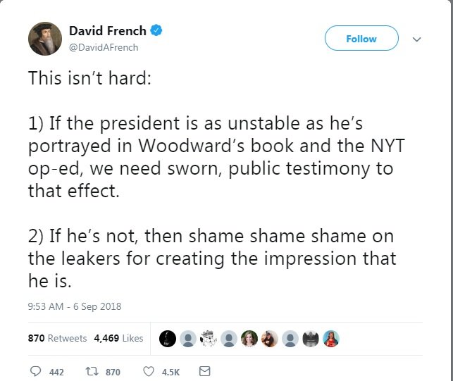 I think my tl/dr version of that expands on the reality that in the OP-ED article he isn't even "portrayed" as unstable. He's alleged to be unstable. No evidence is described therein to show instability. I find it ridiculous that the writer would say that he's part of some republican resistance to the President who is preventing the President from following through on his worst impulses and inclinations, and who is thwarting the President from his worst policy decisions, but the op-ed specifies exactly zero examples of where the President's impulses, inclinations and bad policy decisions were, in fact, stopped.Joe wrote: ↑Fri Sep 07, 2018 3:00 amBetter refutation in a tweet.Forty Two wrote: ↑Thu Sep 06, 2018 4:09 pmSeabass wrote: ↑Wed Sep 05, 2018 11:18 pmThis whole Trump episode feels like a bad episode of Twilight Zone.