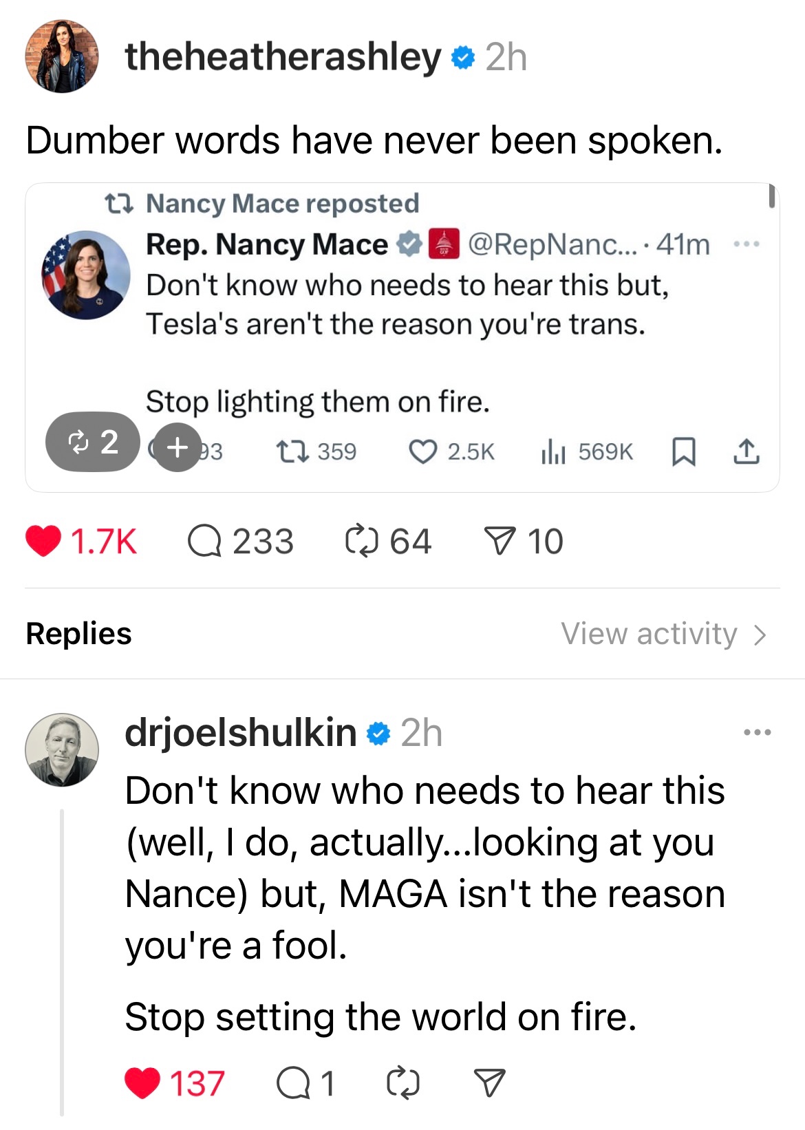 I'm not sure that legal move would be possible. I'm against the Tesla destructions for two reasons; it is a waste of a bit of clever technology, and it tends to produce both some sympathy for Musk, and a perception that the movement against Trump is one of irrational violence, even though the perpetrators are a tiny minority.Tyrannical wrote: ↑Fri Mar 21, 2025 12:57 pmAttacking Teslas in 'protest' seems really dumb from a liability standpoint. If responsibility could be traced back to some 'organization', donors to said organization could be on the hook for damages. Which could be in the billions when stock price drop is considered.