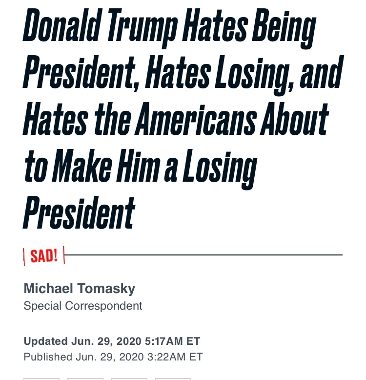 He wants to win the election, that much is clear, because to him far more than most people, life is about winning, and if you’re an incumbent president and you lose re-election, you will be remembered as an all-time loser. No getting around that. Jimmy Carter—loser. George H.W. Bush—loser. There are more important reasons to want to see Joe Biden crush Trump in November, but very high on my list will be the joy of knowing that Donald John Trump will go down in history as a huge loser, especially if he gets trounced.