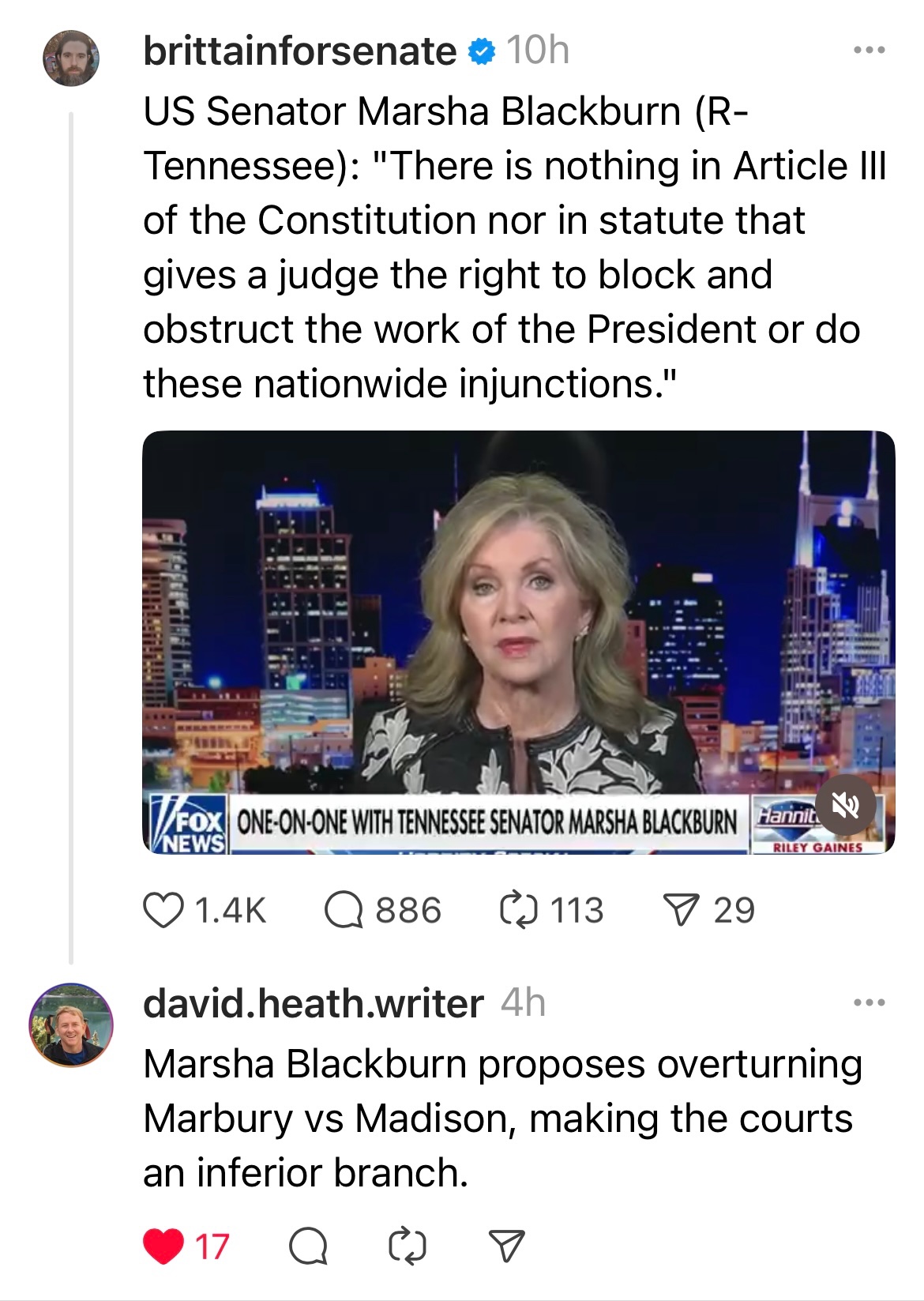 Marsha actually brings up a point. The courts are not as clearly outlined. The founding fathers just assumed there would be courts. That first ruling gave them a lot of power. The current court gave Trump immunity. First court to chip away at their own power.