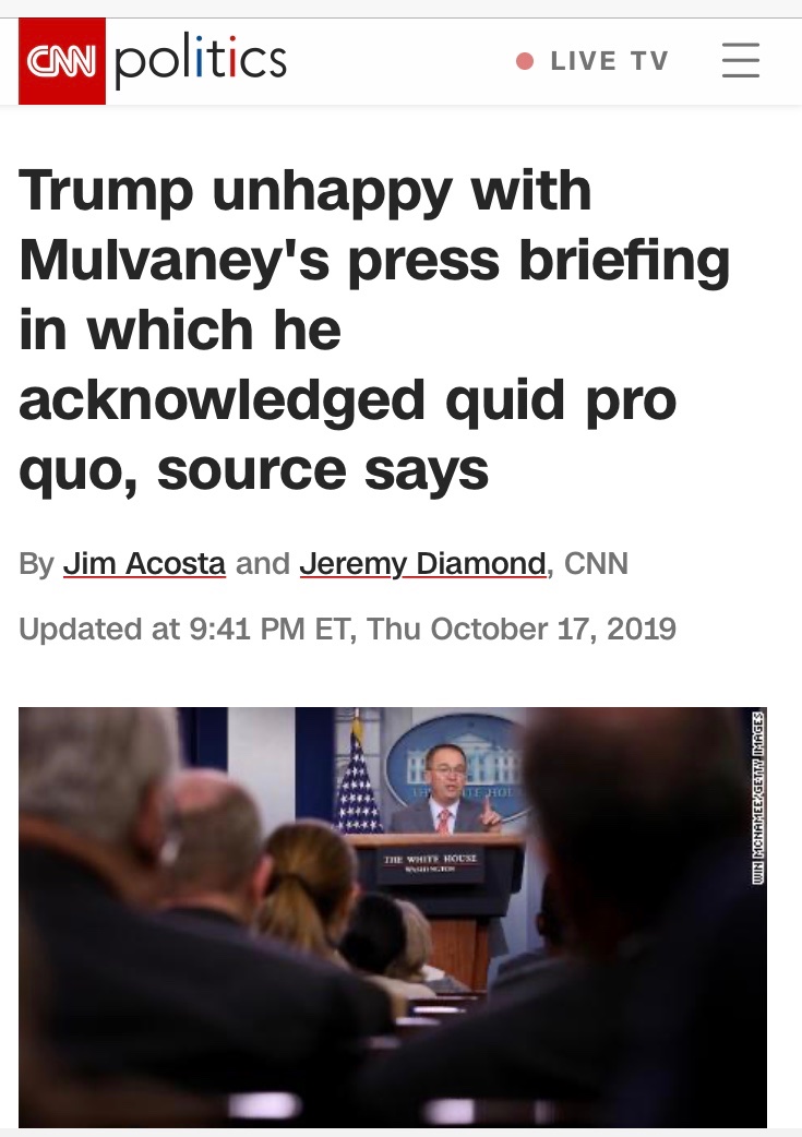 But..... What if Ukraine delivers ?L'Emmerdeur wrote: ↑Tue Oct 15, 2019 10:18 pmMore on the Fiona Hill testimony. That vile flying monkey Mick Mulvaney was up to his neck, helping Trump, Giuliani & Co. to extort political help from Ukraine.