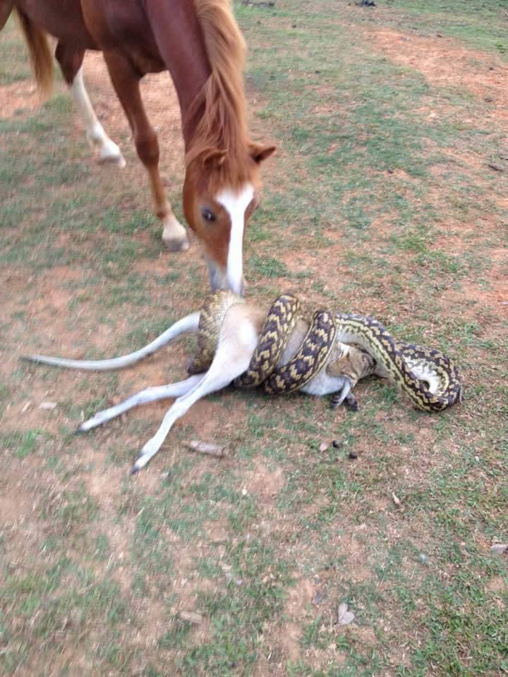 Another wallaby taken by a python. Horse is an interested spectator.