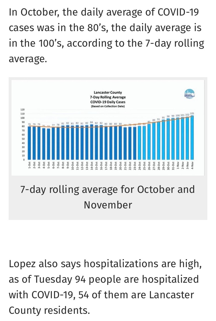 Hospitalizations for COVID-19 patients: 91 with 54 from Lancaster County (3 on ventilators) and 37 from other communities (10 on ventilators). Note: This includes patients who no longer test positive for COVID-19 but continue to be hospitalized.