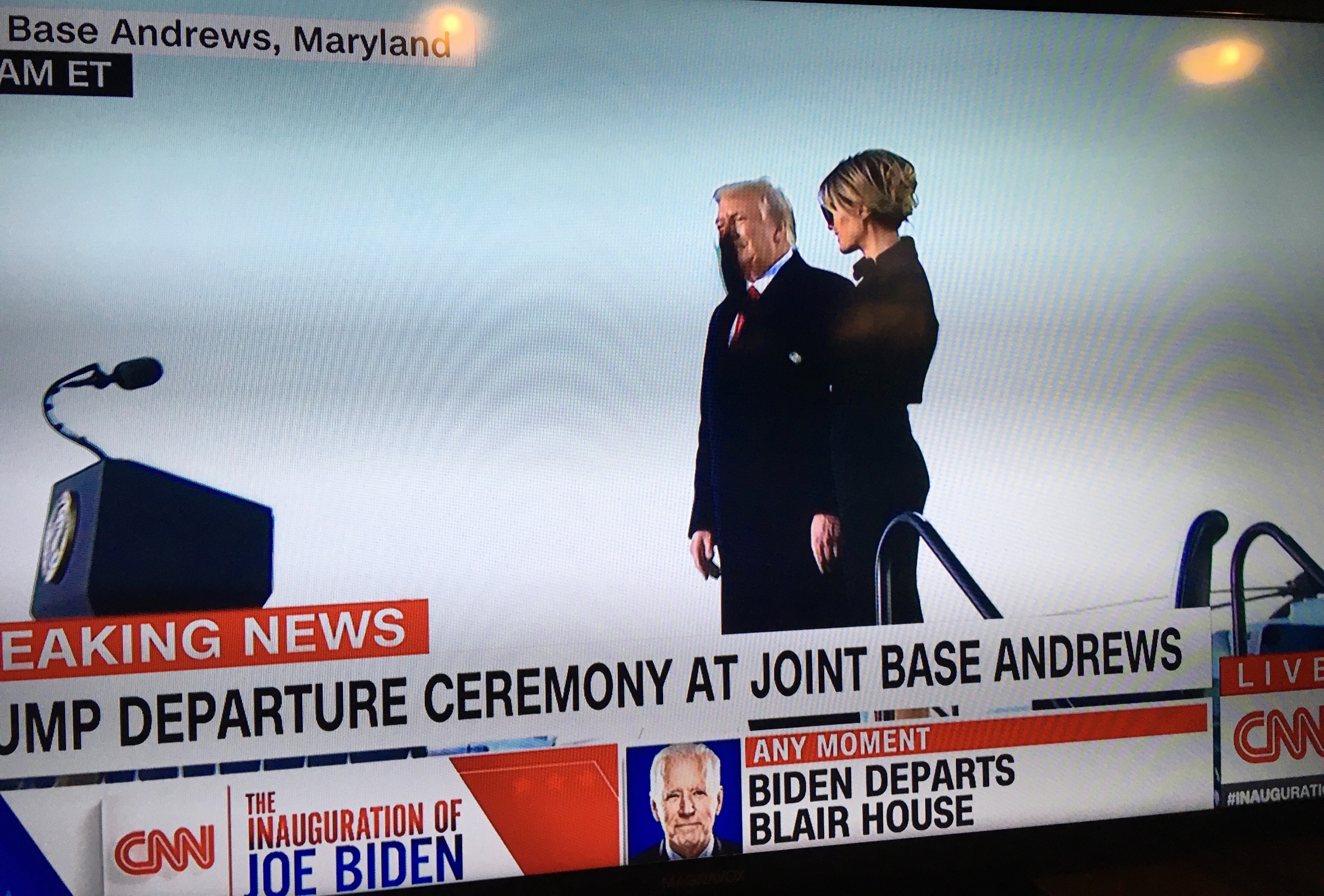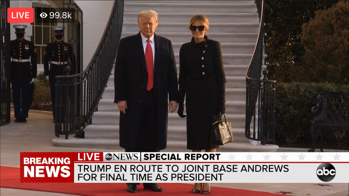 The 10 min ride to Andrews. Ivanka and Kushner were not in the helicopter. They were driven there. Small MAGA group at airport. 21 gun salute to come.