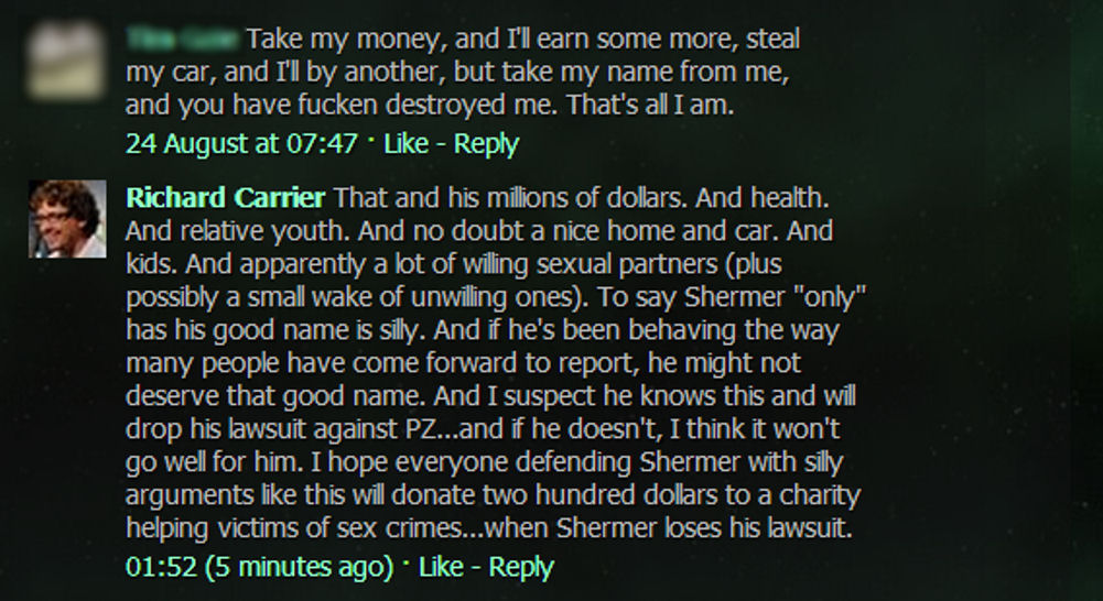 Thinking Aloud wrote:That also implies that Shermer knows who the accuser is, which is at odds with her apparent desire not to reveal her identity to him for fear that "he will come after me in some way." So either it's progressed legally far further than we're aware, or someone somewhere isn't very good at keeping secrets.