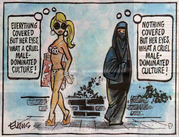 Geoff wrote:I think it comes down to choice. In the "Western" example, she or any other woman can wear what they want, whether that's sexy clothes, business suits, scruffy tracksuits, whatever. With the burqa and hijab, in most cases they're forced by their menfolk to wear them.