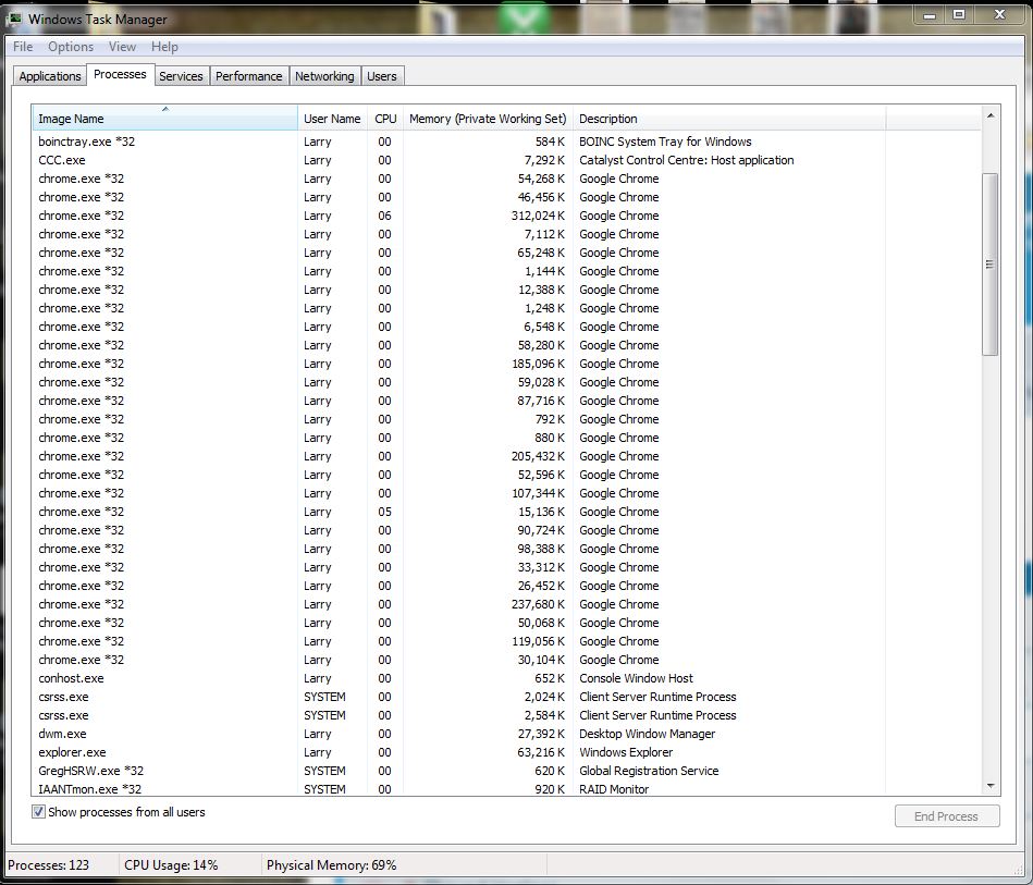 Christ there's a lot of Chrome processes there. That doesn't seem normal to me. There really should only be one (unless chrome works differently from other software). Click on the "memory" column once, or twice if necessary, to sort via memory usage with the biggest usage up the top and post a screenshot.