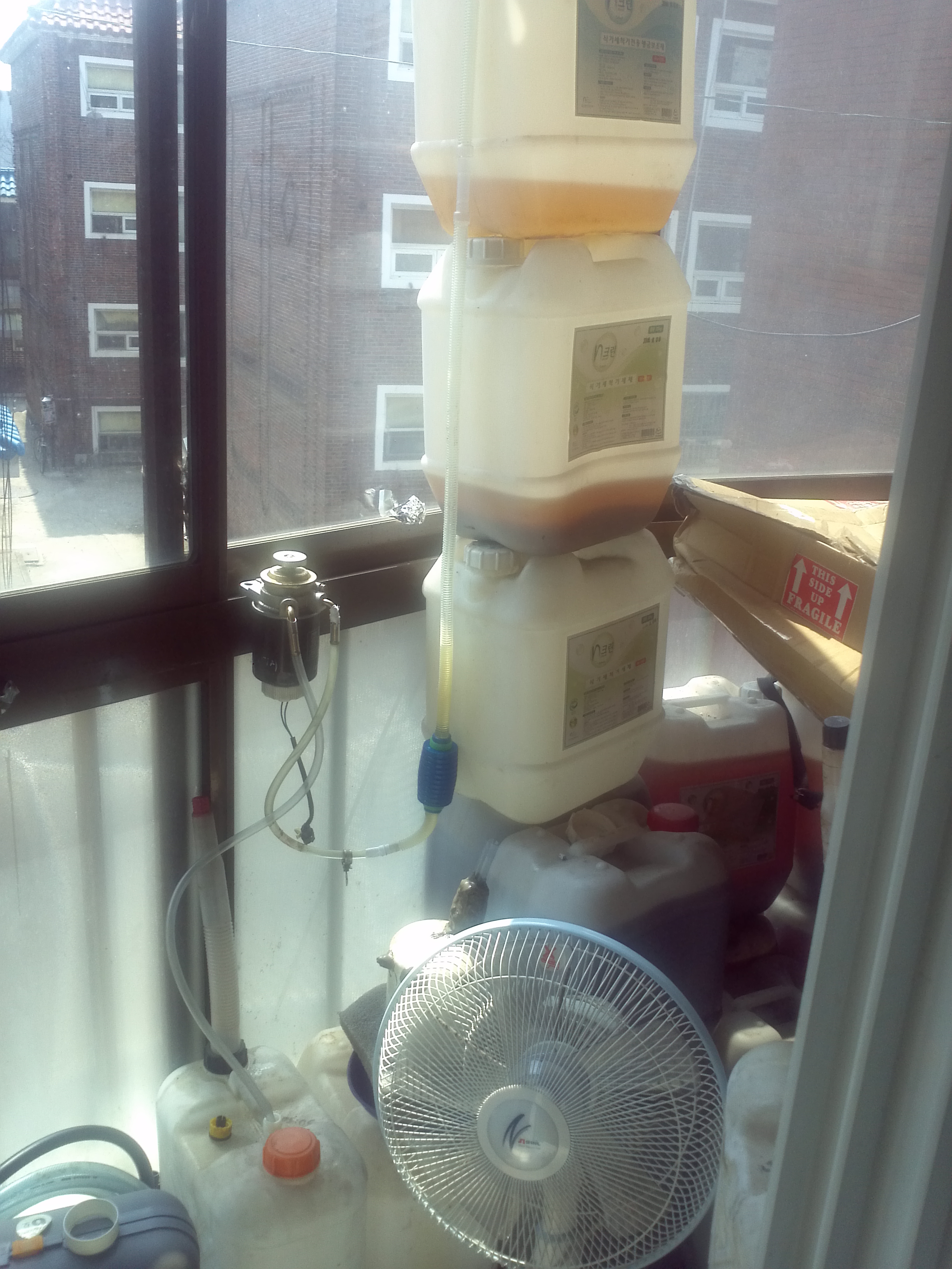 I have 20-litre bottles of unfiltered WVO, a hand-pumped siphon, clear tubing, a very large truck oil filter and collection recepticles.