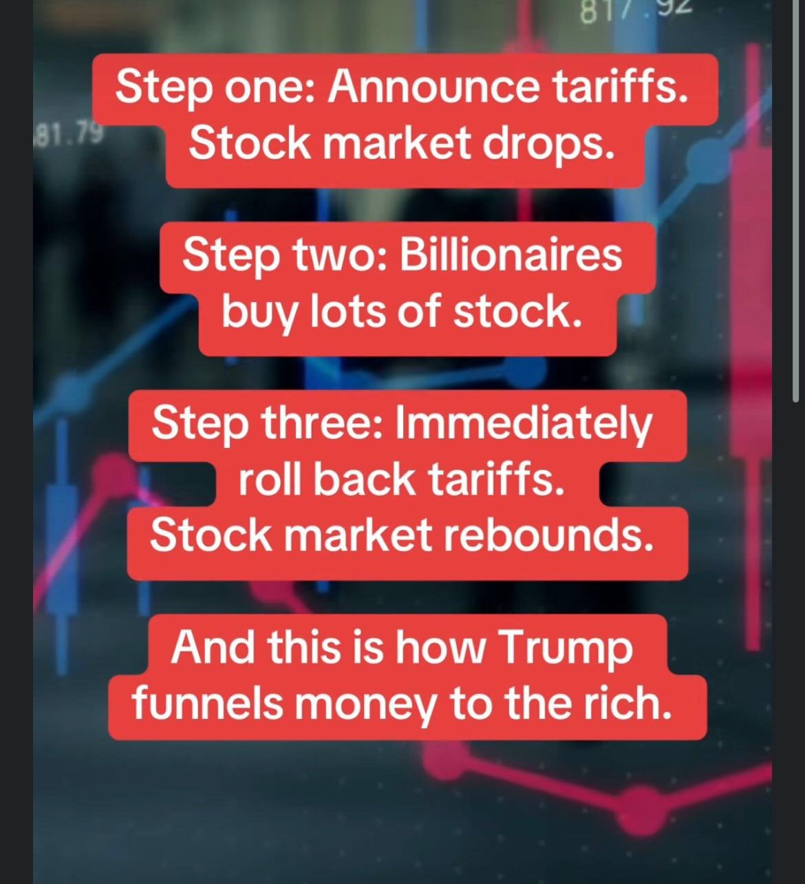 So, the implication is that a tariff roll-back was always part of the plan, and that Trump's rich friends knew this, and that by buying and selling at the right time could make profits.