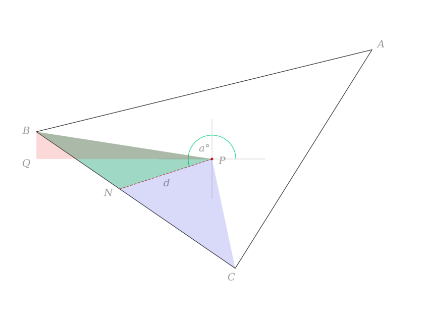However, in order to make a formula out of this that works for every △ABC, point P within it, and possible angle a, I'll have to think about accounting for the quadrants of the main vertices of △ABC fall into in relation to wherever P is along with the terminal of whatever a turns out to be.