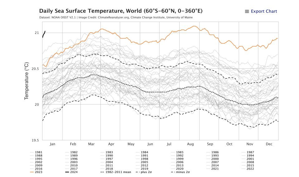 The oceans absorb 90% of the heat trapped by the carbon emissions from the burning of fossil fuels, making it the clearest indicator of global heating. Record levels of heat were taken up by the oceans in 2023, scientists said, and the data showed that for the past decade the oceans have been hotter every year than the year before.