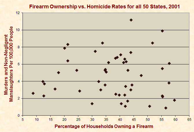 2) This assertion is missing key information and can be deceptive because it accounts for murders committed with guns but fails to account for lives saved with guns. Hence, it neglects the primary issue, which is the overall rate of violent deaths. This is significant because, as the chart below shows, many states with higher gun ownership rates also have the lowest homicide rates: