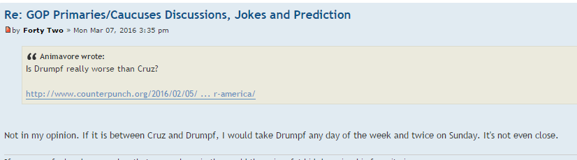 Not in my opinion. If it is between Cruz and Trump, I would take Trump any day of the week and twice on Sunday. It's not even close.Animavore wrote:Is Trump really worse than Cruz?