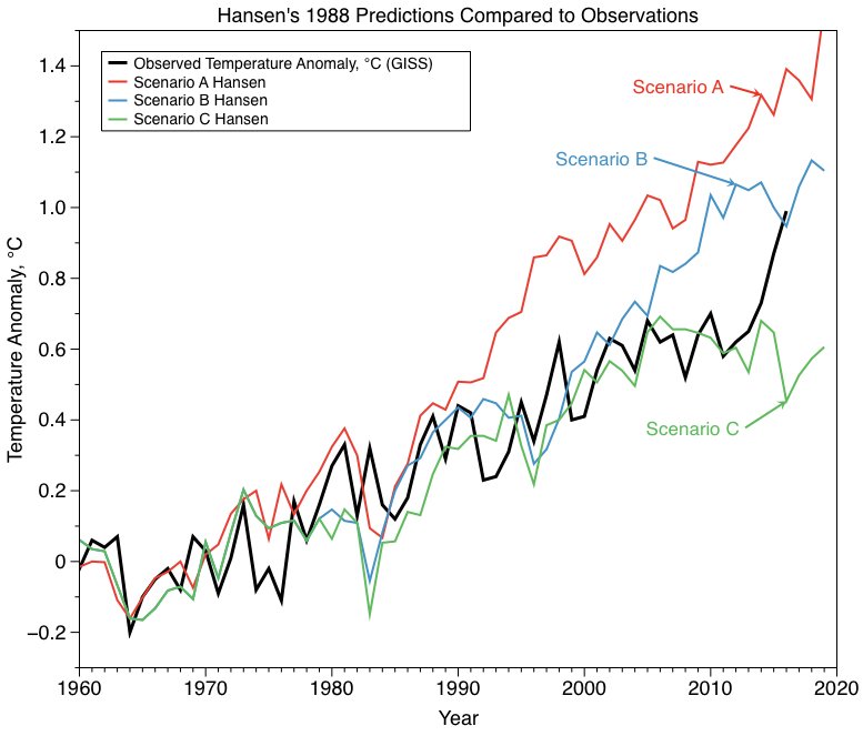 Predition made by James Hansen in 1988. The red represents a ramping up of CO2. The blue represents business as usual. The green represents people taking action and curbing CO2 back in '88. The black is observed reality.