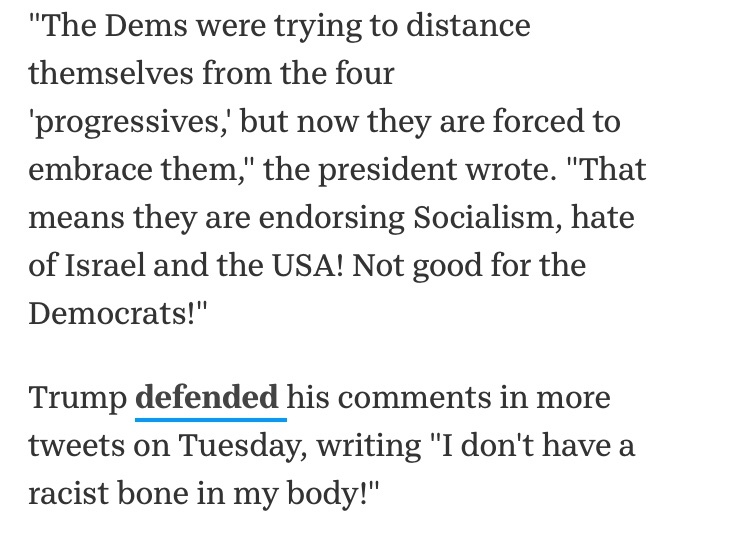 Those nasty women need to apologise!While Trump was taking questions from reporters during an event that was ostensibly supposed to be a “Made in America Product Showcase,” Fox News reporter John Roberts asked him if it concerns him that “many people saw that tweet as racist and that white nationalist groups are finding common cause with you on that point?”