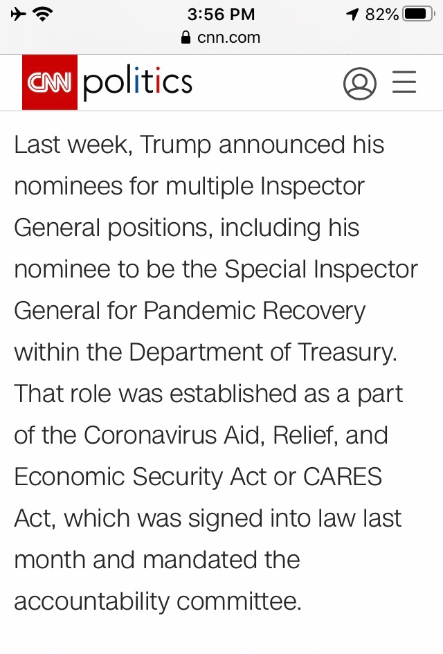 Trump removed a Pentagon official tapped to oversee the coronavirus relief effort from his post. Acting Pentagon inspector general Glenn Fine was supposed to oversee implementation of the $2 trillion coronavirus bill, but an agency spokesperson confirmed he is no longer in the role.