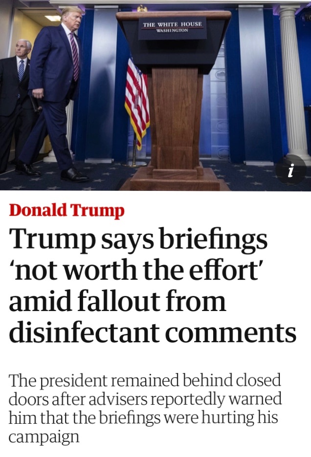 The abrupt end of Friday night’s daily press conference, which has become a ribald, unruly and often shocking ritual in America during the coronavirus pandemic, was probably the clearest sign yet of how badly Trump’s bizarre statements over disinfectant have shaken his administration.