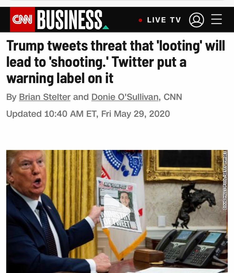 https://www.thedailybeast.com/stabbing- ... ref=scrollAfter midnight, the president threatened a violent response. “These THUGS are dishonoring the memory of George Floyd, and I won’t let that happen,” he wrote on Twitter.
