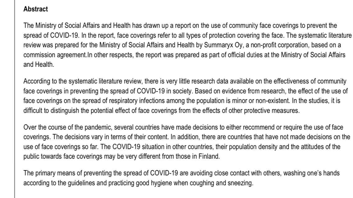 Finnish health ministry scraps any support for essentially the surgical masks and other non n95 masks.