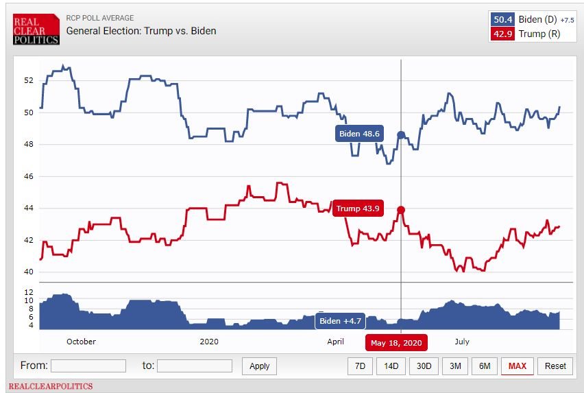 I moved the line to May 18 where Trump had a small peak. He is now at 42.9 and Biden at 50.4.
