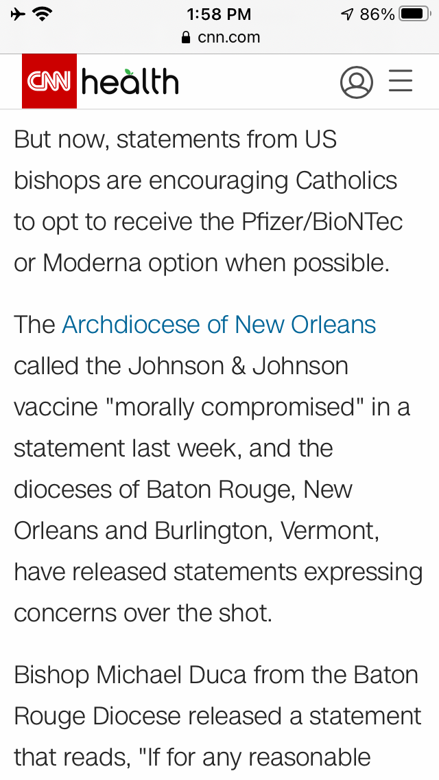 The statement, which was echoed in Burlington, went on to say that the decision to receive the vaccine is between an individual conscience and their health care provider, but that "in no way does the Church's position diminish the wrongdoing of those who decided to use cell lines from abortions to make vaccines."