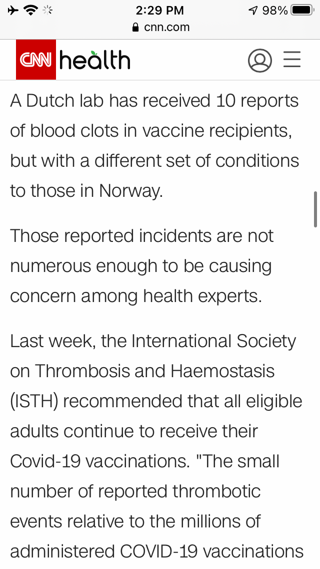 I agree. The Australian authorities have chosen not to pause the vaccine roll-out here. I'll happily take my shot when it comes.Brian Peacock wrote: ↑Tue Mar 16, 2021 8:35 pmThe clots are interesting. These kinds of thrombotic episodes are vanishingly rare in the general population - around 10-15 per million annually. The rate in the recently vaccinated is about the same, but of course they've all come within a couple of months. Now, is a 1 in 100,000 chance if being unlucky worth avoiding the vaccines for, particularly when countries like the UK have seen Covid deaths at around 50 per 100,000?