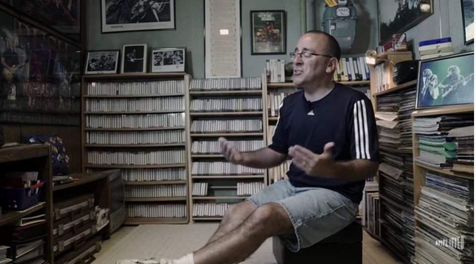 Rush fan in his basement (you can see the gas meter) with his Rush collection