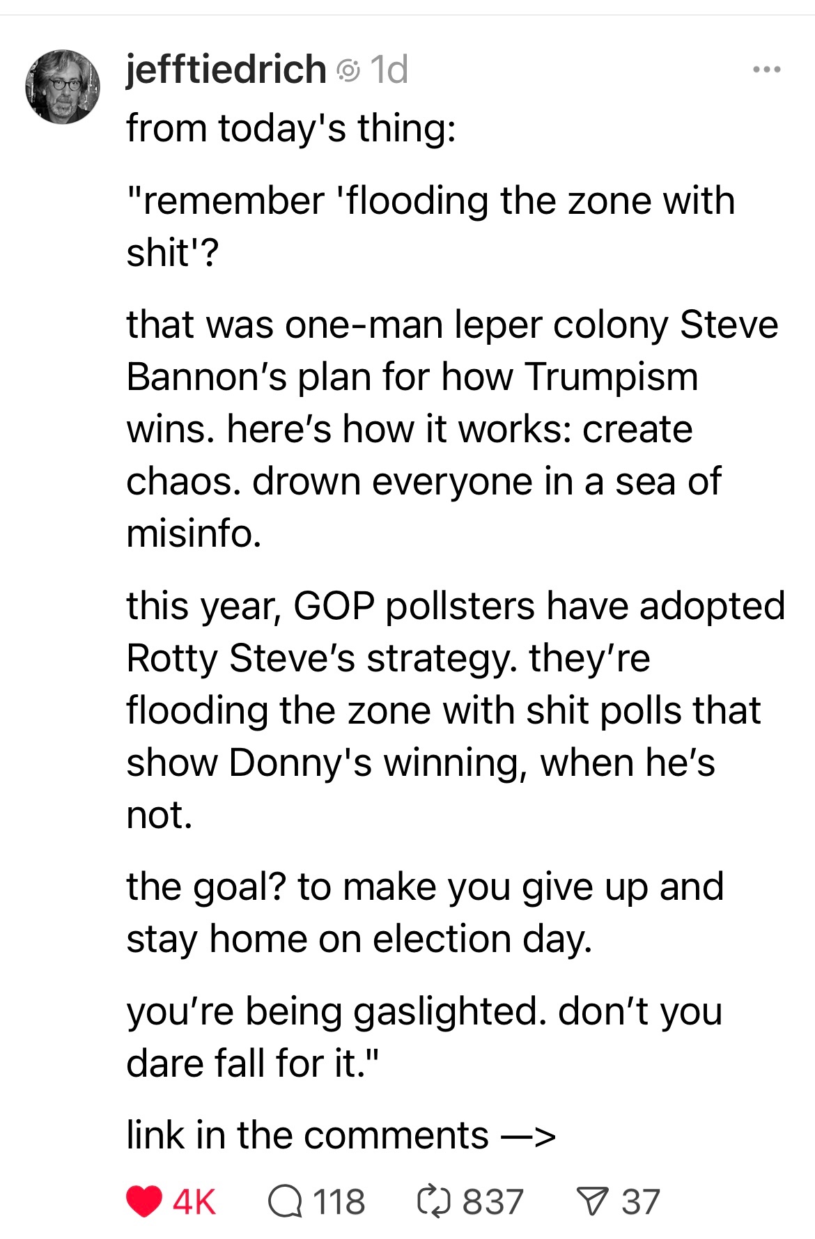 The 3 percent lead Harris had in some battleground states is down to 1%. Because....the models? The sampling? The undecided/middle of the range voters did decide but are no longer answering the phone?