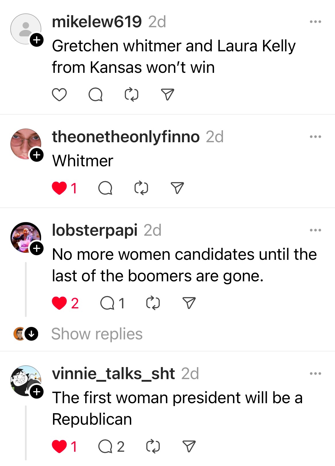 One of my threads hot 20 comments. On 2028 election. I did not post about women. These people did.