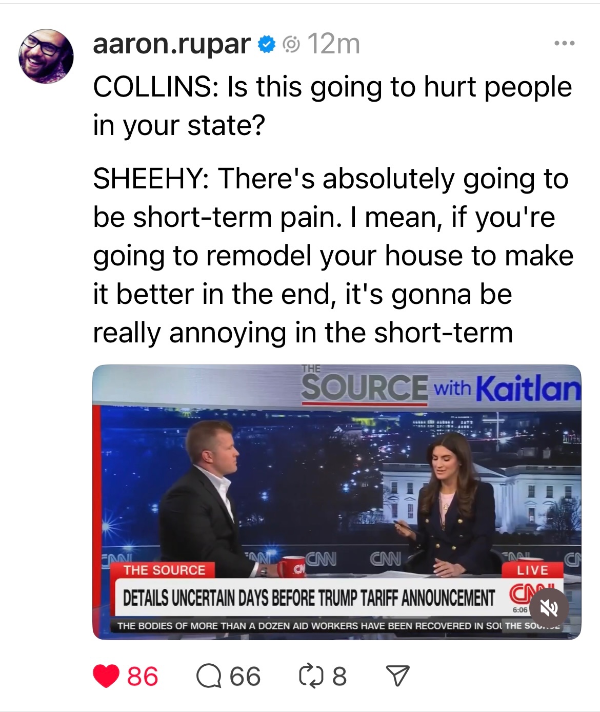 I do not think that the Republican party gives a shit about the ordinary people supporting it. They vote along the party lines, not according to what is best for their constituents.JimC wrote: ↑Sun Apr 06, 2025 8:49 pmAs admirable as the protests are, they will not change the political trajectory of the Trump administration. Courts may snipe around the edges, but the only thing that could actually alter economic decisions of the Whitehouse would be pressure from the big end of town if they see their wealth in jeopardy...