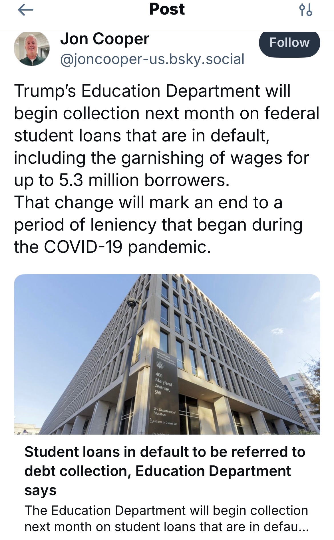 Lovely how the "dept of education" is pared down to a debt collection office, and no longer helps providing people with an educationTero wrote: ↑Tue Apr 22, 2025 11:47 amYou went to college and studied woke things like science and history? MAGA and Trump must punish you.