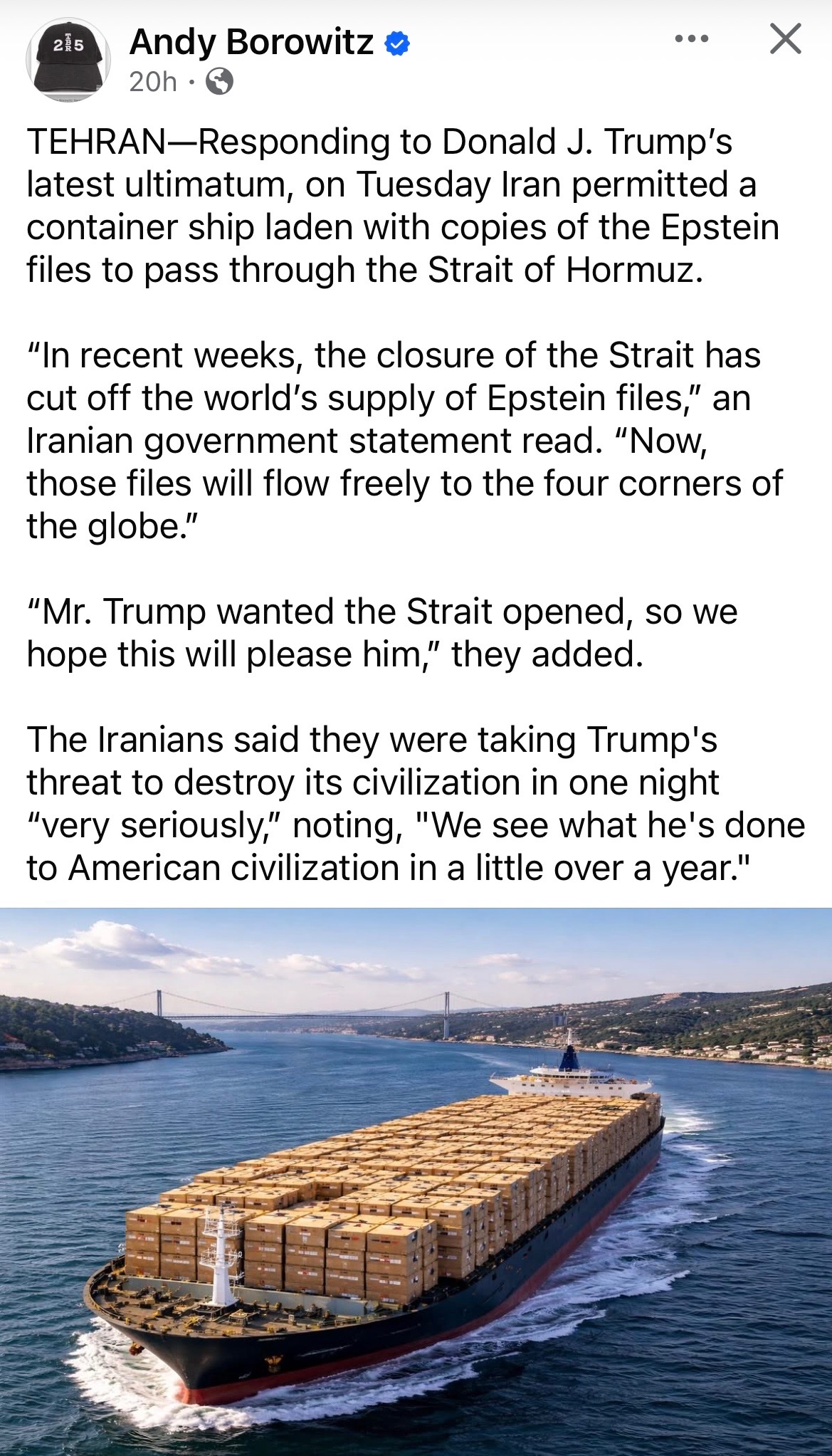 There are still only two tests: when he can't get up Airforce One stepsSean Hayden wrote: ↑Mon Apr 06, 2026 5:24 pmGah! I’m not touching that. Get back, you’re not going to taint my algorithm with Trump!