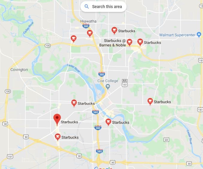 Pete B is next door in the metropolis of Cedar Rapids, which has some 9 Starbucks stores. Counties that have ZERO Starbucks stores are known to be 80-90% republican. In the middle of the USA here. In California, a Starbucks has much more power, just one store marks a vast Democratic stronghold.